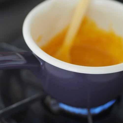 3. 將混合好的蛋黃糊以小火慢慢加熱,用耐熱刮刀持續攪拌,煮至燕麥粥狀,繼續攪拌到無水狀態後,