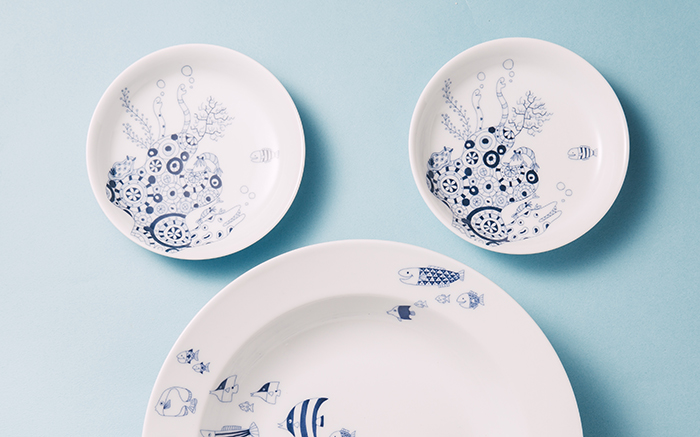 日本長崎市波佐見町手工燒製瓷器,北歐風格Natural 69設計小菜碟,純白底色配上各類魚群悠遊在海洋中的輕鬆步調,大小適中,盛裝各式小菜或醬料好輕爽~