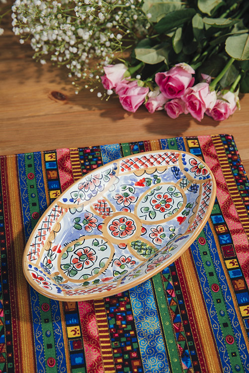 西班牙Toledo地區Cruz陶製廠秉持將陶器融入生活當中的用心,製作許多廚房餐具,讓陶器不只是美的藝術品,更能使用於日常生活,貼近人心的花卉圖藤,帶出低調而又奢華的浪漫情懷