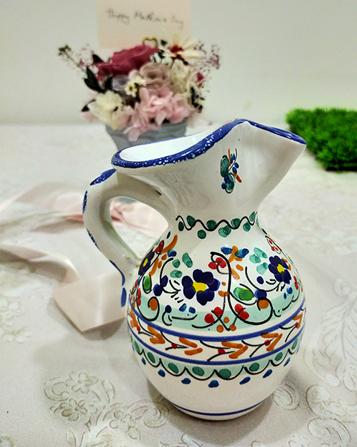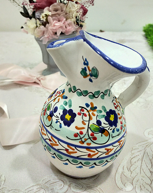 西班牙Toledo地區Cruz陶製廠秉持將陶器融入生活當中的用心,製作許多廚房餐具,讓陶器不只是美的藝術品,更能使用於日常生活,貼近人心的白底設計搭配花卉圖藤,可裝白開水或茶、咖啡皆適宜, 亦可做為奶精瓶, 牛奶壺帶出低調而又奢華的浪漫情懷~