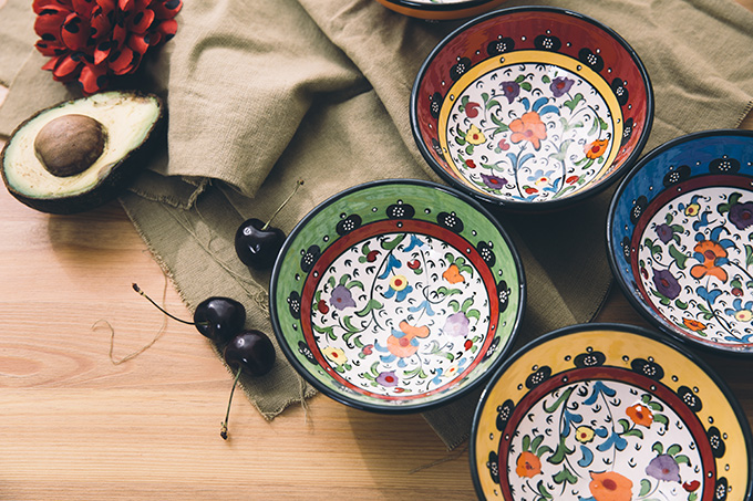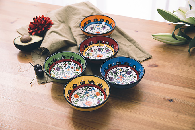 西班牙當地手工職人細心為每一件手工藝品製作,經由陶土定型及素燒加熱至1020。C,再上釉各式彩色當地特色圖案後二次燒製定型才能完成各式鮮艷活潑的彩色陶器。歐洲難得一見的湯碗系列讓台灣的朋友使用起來更感温馨親切。不論搭配Tapas下酒菜或中式的飯菜,都更顯美味可口。